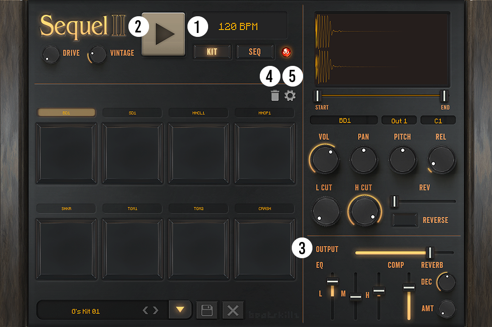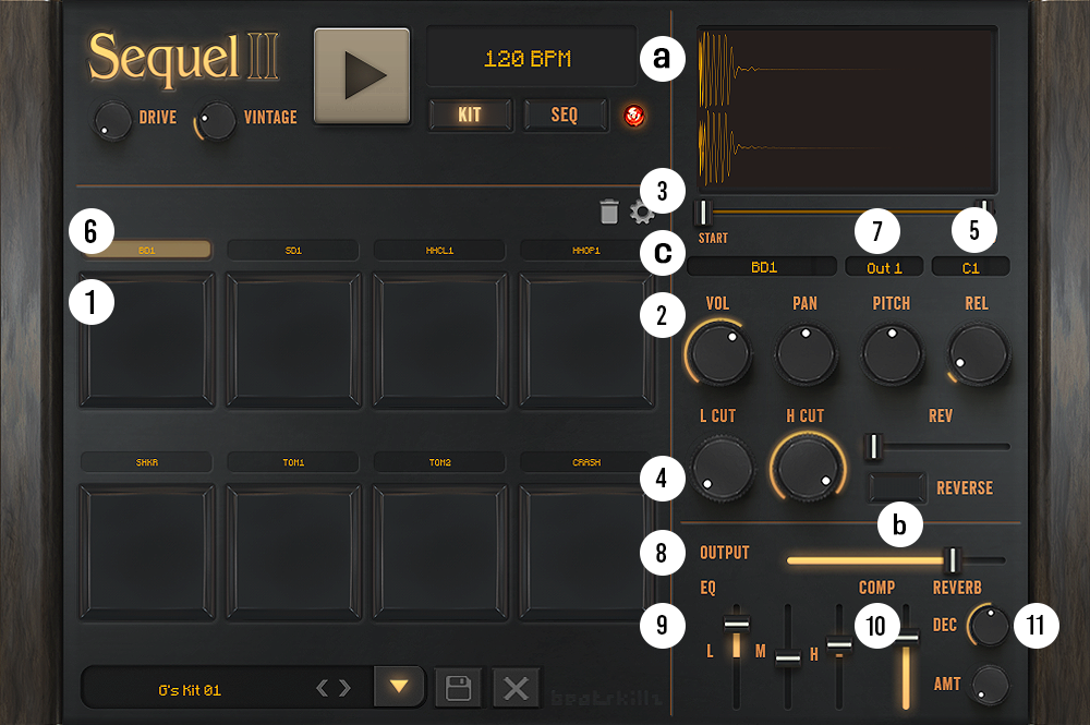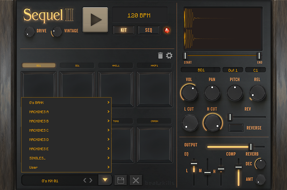 Sequel 2 is a complete drum sampler with parameters such as pitch shift, Lp / Hp filters, pan, levels, and reverse sample, per pad/sample. You can also trim your samples by using the sample start and end controls.