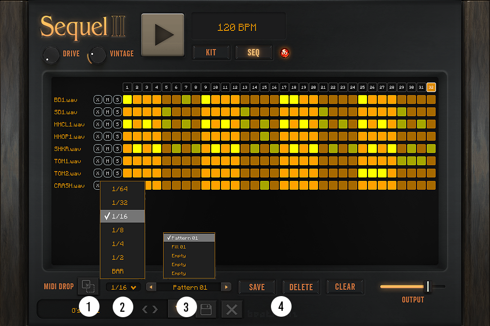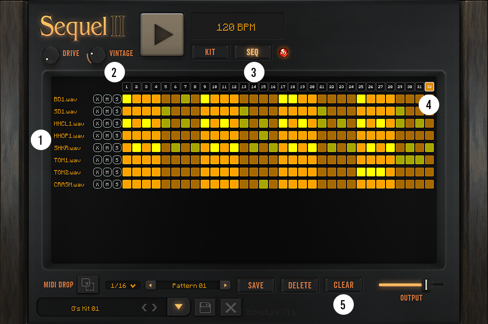 - 4 - Pattern Save & Clear: Save your own pattern using this button and then save the drum Kit to retain all the kit settings and the sequencer patterns. Use the Clear button to delete a saved pattern and make room for a new one.