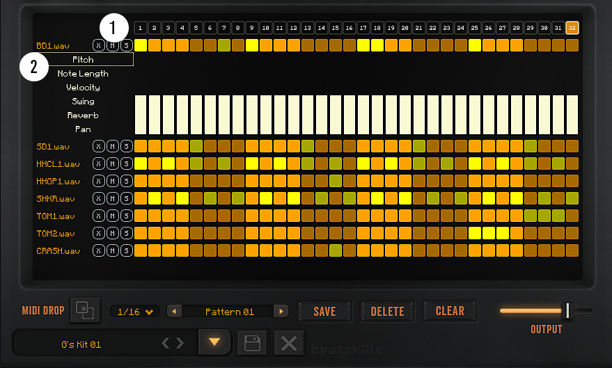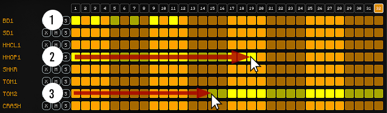 - 1 - The orange squares represent each step-per track which is empty and doesn't have a trigger on it. If a trigger is placed on a step, its colour changes to yellow. Clicking the mouse button on the square will enable the trigger or disable it in a toggle-button-like fashion and turn the colour of the step number to Orange.
