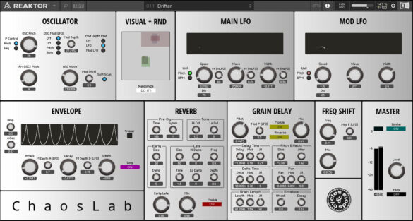 Cycles & Spots deliver another great synth for Native Instruments Reaktor, this one is an endless randomizable experimental sound generator. ChaosLab can play by itself and is also playable via MIDI input. It's basically a modular system that literally configures itself with the push of a button. That way you can create hundreds of sequences / drones / sounds which also can modulate themselves endlessly.