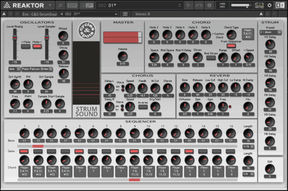 Cycles & Spots crafted a polyphonic synthesizer for Reaktor that can be strummed like a guitar and sequenced with different harmonic chord types. It produces sound via built-in analog modeled oscillators mixed with 100 samples and includes humanization randomness options. Further, the sound can be shaped using a chorus and a reverb. It also lets you create a custom strum pattern and a custom chord.