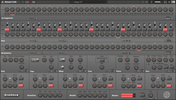 This is an analog modeled drum machine for Reaktor that feels alive, meaning it uses modulation, probability and automatically makes fills from the main pattern, at certain chosen points in time. It features a kick, clap, hihat, tom and percussion, in general sound-wise roughly between a 909 and an 808, also it uses their accents option. An Overdrive effect is implemented and can be mixed in from subtle to extreme to get even mo