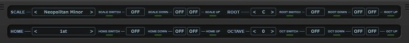 Scale, Root, Home, Octave Switch keys. These assign a series of midi notes to be used to switch between specific values just by hitting a single note. For example by setting Root Switch to 'C2-B2', C2 on the controller will set the key to C, C# will set the key to C# and so on.