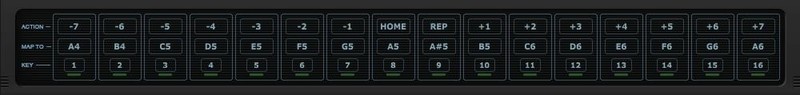 Playing Keys with lots of options. For each of the 16 playing keys, there are two menus. The mapping menu, and the action menu. First one determines where the key is placed on the controller, and includes a list of MIDI notes. The second menu determines what the key does and includes some static and some relative options like 'Home', 'Repeat', '+1', etc. You can read more about the playing keys in the manual.