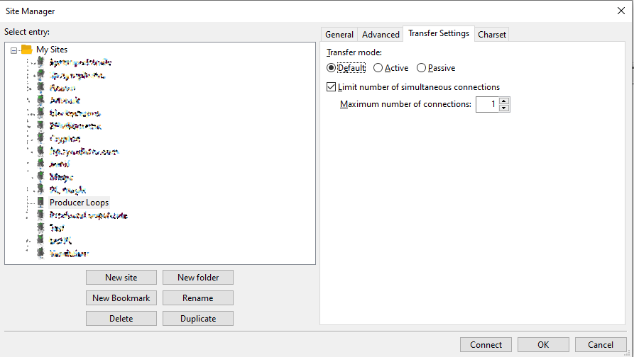 Site Manager Settings for Producer Loops account - Transfer Settings Tab